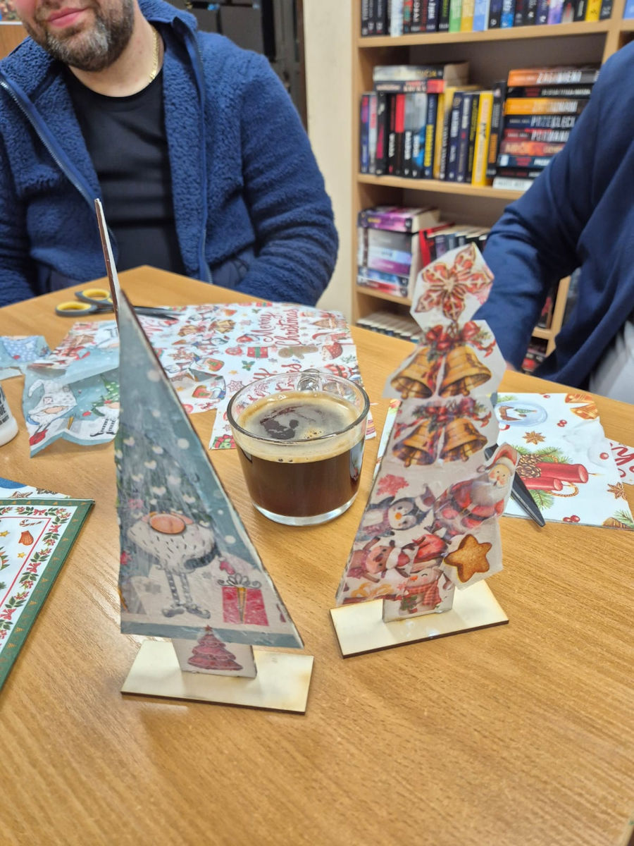 Następnie odbyły się warsztaty świąteczne, poprowadzone przez panią Małgorzatę Mazur, podczas których rodzice wspólnie z dziećmi ozdabiali drewniane choinki wykorzystując technikę decoupagu. Zajęcia cieszyły się ogromnym zainteresowaniem – panowała twórcza atmosfera, a wykonane prace zachwycały pomysłowością i starannością.