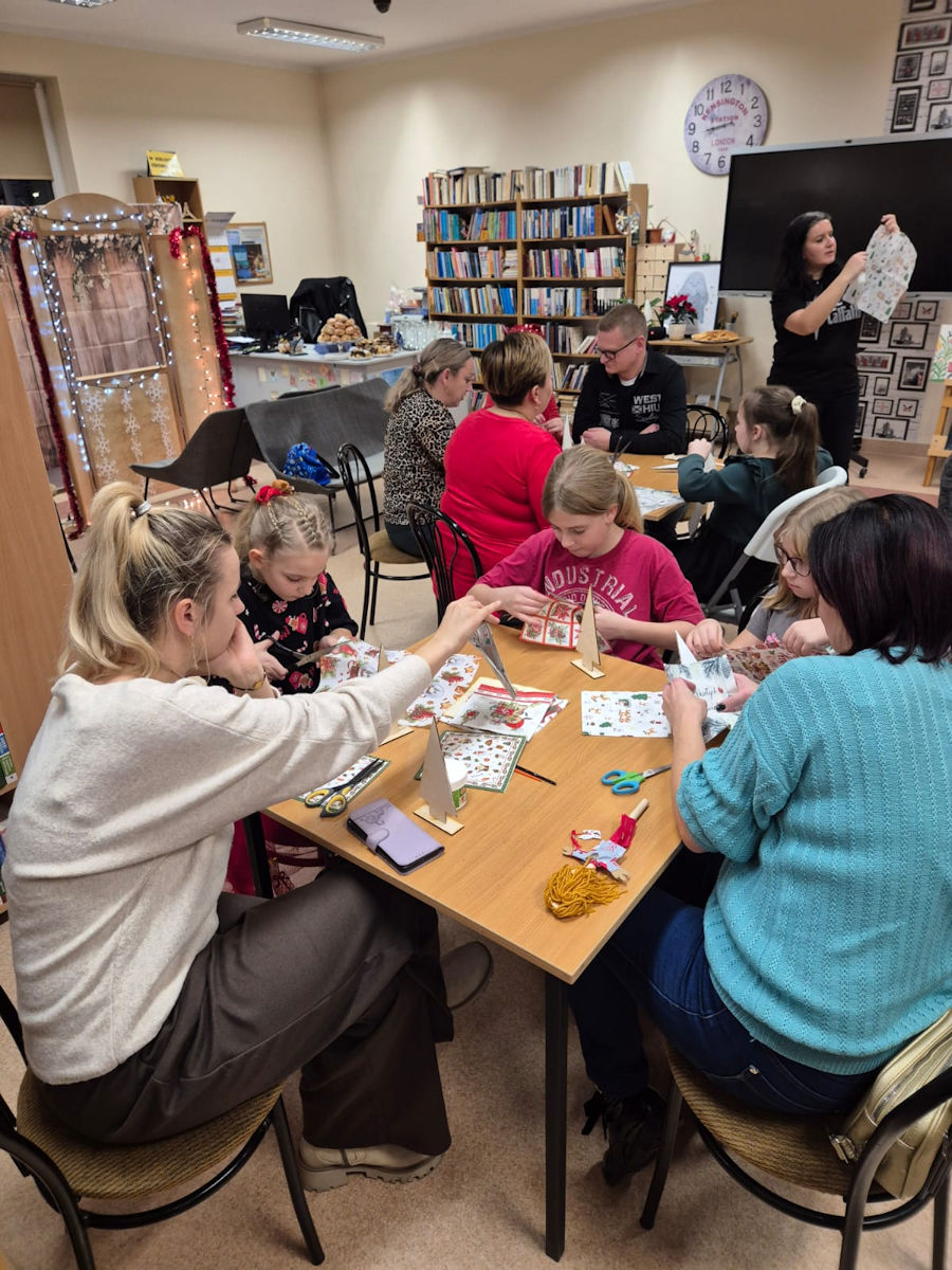 W czwartek – 11 grudnia 2025r. w Bibliotece Publicznej odbyło się spotkanie z rodzicami, które miało na celu wspólne spędzenie czasu, integrację oraz wprowadzenie w atmosferę nadchodzących świąt. W wydarzeniu uczestniczyli aktorzy z koła teatralnego oraz ich rodzice.