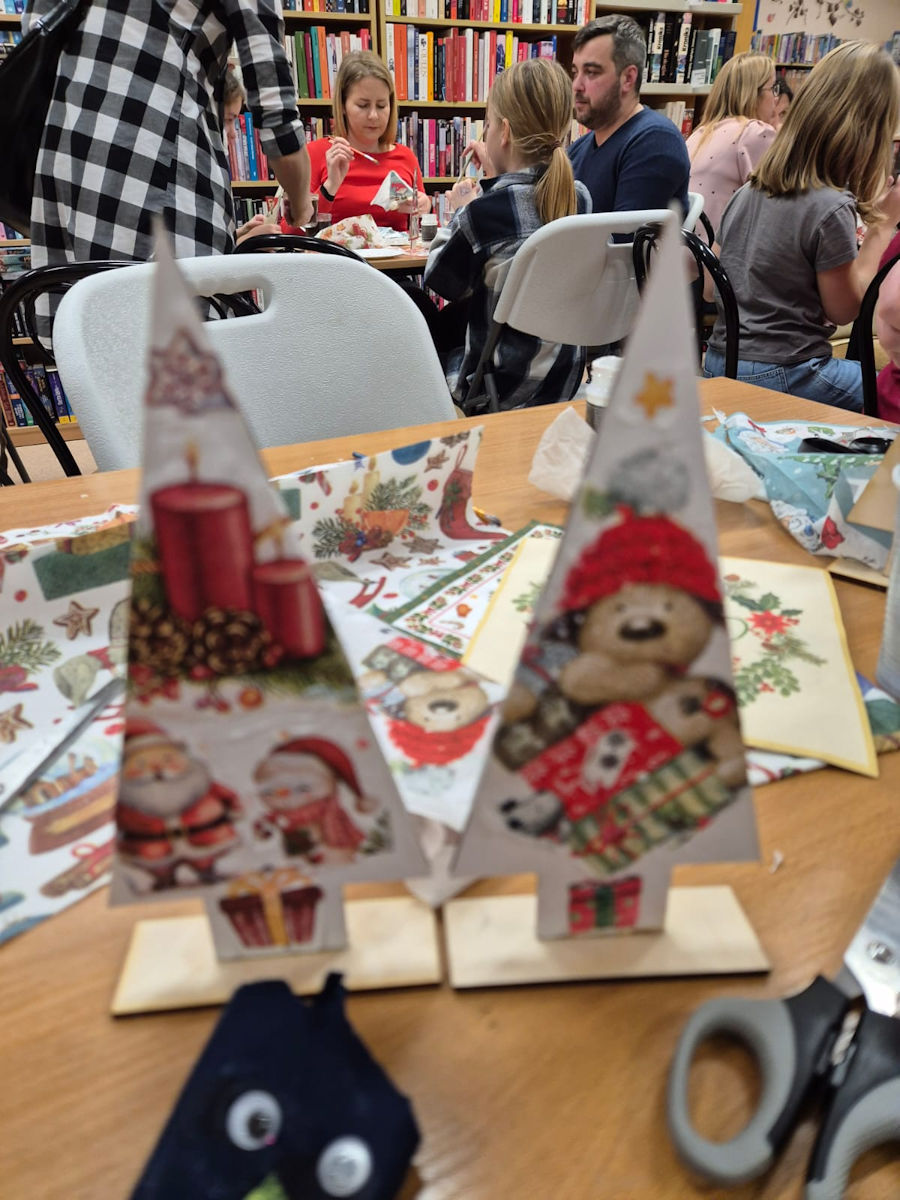 Następnie odbyły się warsztaty świąteczne, poprowadzone przez panią Małgorzatę Mazur, podczas których rodzice wspólnie z dziećmi ozdabiali drewniane choinki wykorzystując technikę decoupagu. Zajęcia cieszyły się ogromnym zainteresowaniem – panowała twórcza atmosfera, a wykonane prace zachwycały pomysłowością i starannością.